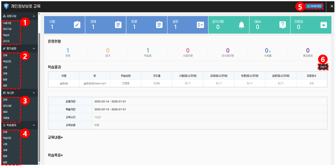 - 학습결과-학습진도 : 개별 학습자의 진도율과 학습 완료 상태를 확인할 수 있습니다.