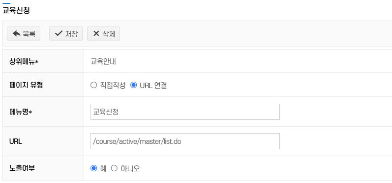 • 페이지 경로는 시스템 내 실제 페이지 경로와 일치해야 하며, 잘못된 경로 입력 시 메뉴 클릭 시 오류가 발생할 수 있습니다.