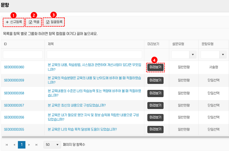 일괄등록기능을 활용하면 다수 문항을 효율적으로 관리할 수 있습니다.