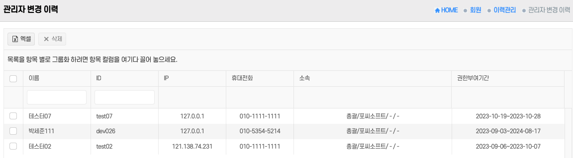 - 이름, ID, IP, 휴대전화, 소속 등을 조건으로 검색 가능