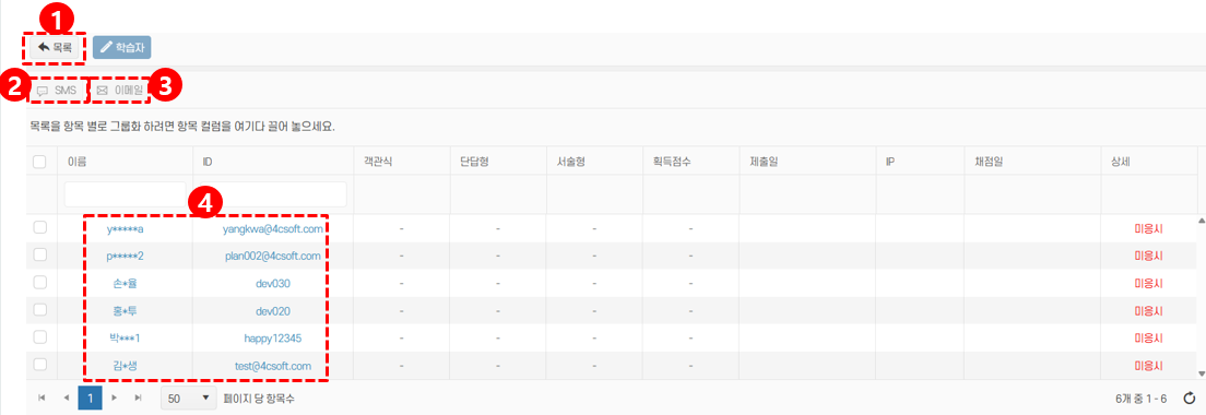 - 선택한 학습자에게 이메일로 시험 안내 또는 미응시 알림을 발송할 수 있습니다.