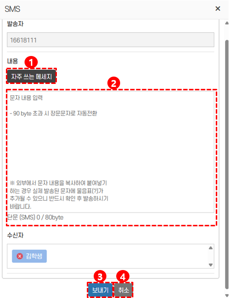 자주 쓰는 메시지버튼을 클릭하여 기존에 저장된 메시지를 불러올 수 있습니다.- 직접 메시지를 입력하려면