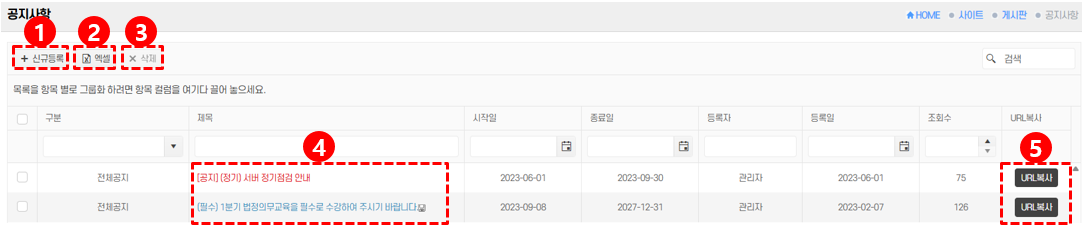 - 상단의 버튼을 통해 공지사항 추가, 삭제, 다운로드를 할 수 있습니다.