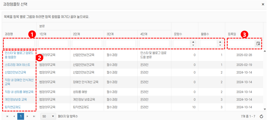 과정 템플릿의 등록일을 기준으로 필터링할 수 있습니다.