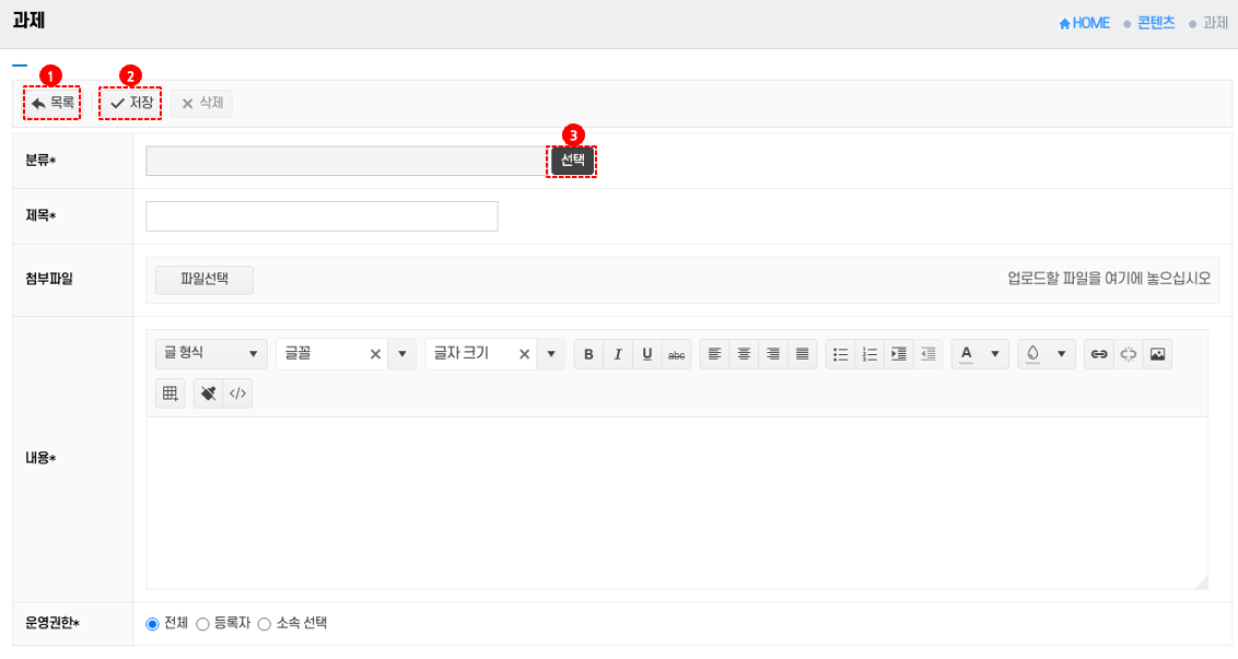 학습자에게 부여할 과제를 직접 등록하고 관리할 수 있는 화면입니다. 과제의 분류, 제목, 내용 작성은 물론 파일 첨부 및 에디터 기능을 통해 다양한 형식의 과제를 생성할 수 있습니다.