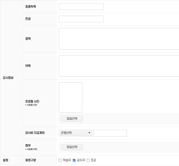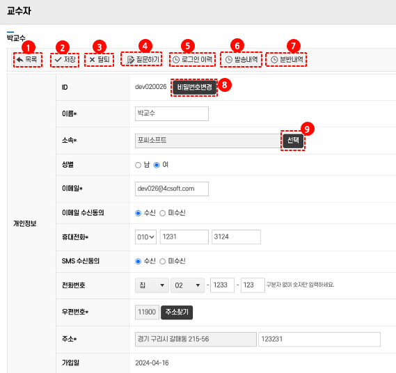 1. 교수자의 정보를 변경하려면 이름, 이메일, 전화번호, 소속 등 수정이 필요한 항목을 입력합니다.