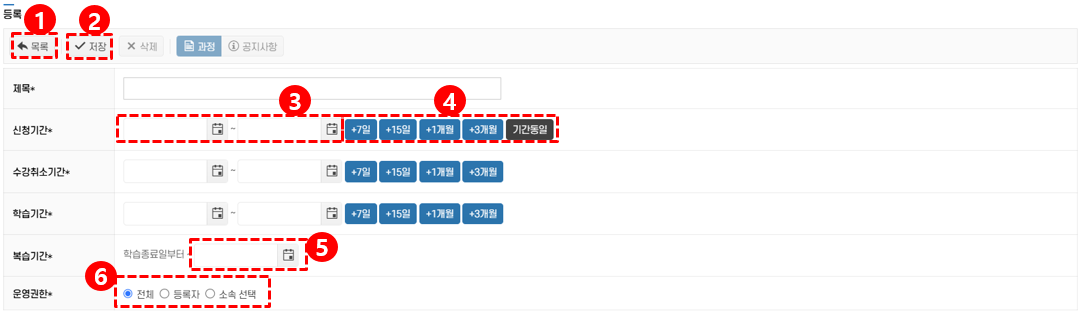 - 신청기간, 수강기간, 학습기간 등에 대해 +7일, +15일, +1개월 등의 빠른 설정이 가능합니다.