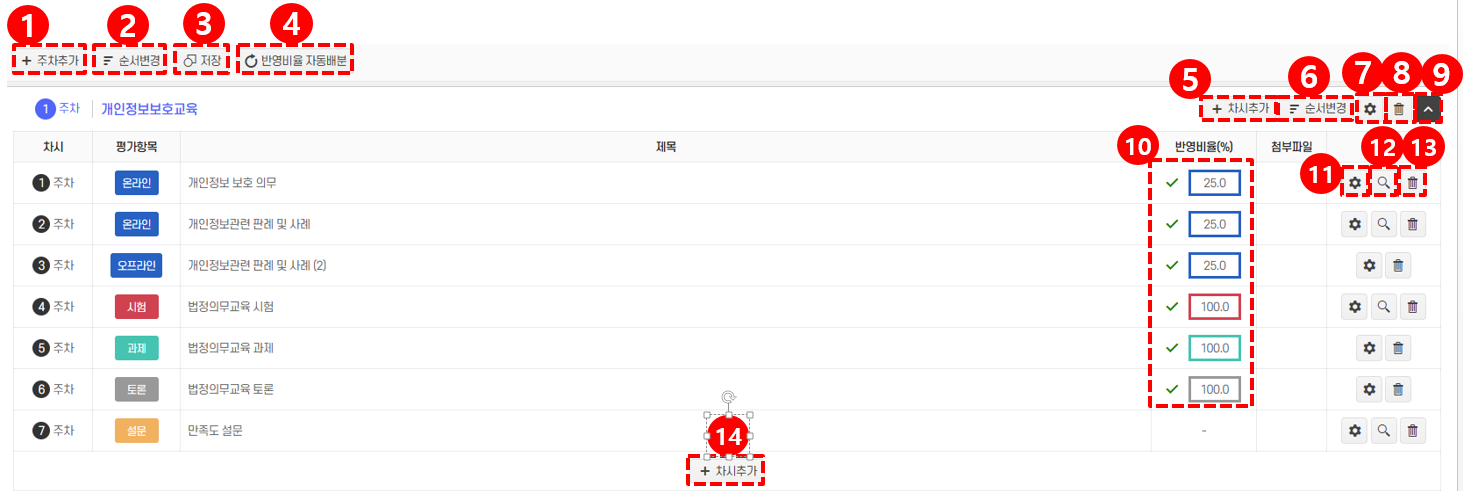 • 순서변경을 통해 학습 순서를 조정할 수 있으며, 차시별 설정이 자동으로 반영됩니다.