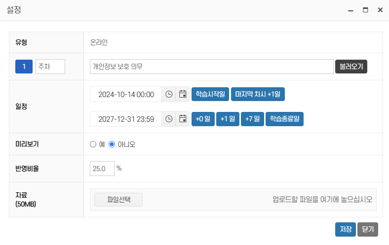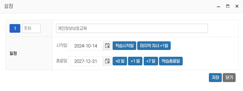 5. 차시별 세부 설정을 수정하려면 설정 버튼을 클릭하여 필요한 정보를 입력합니다.