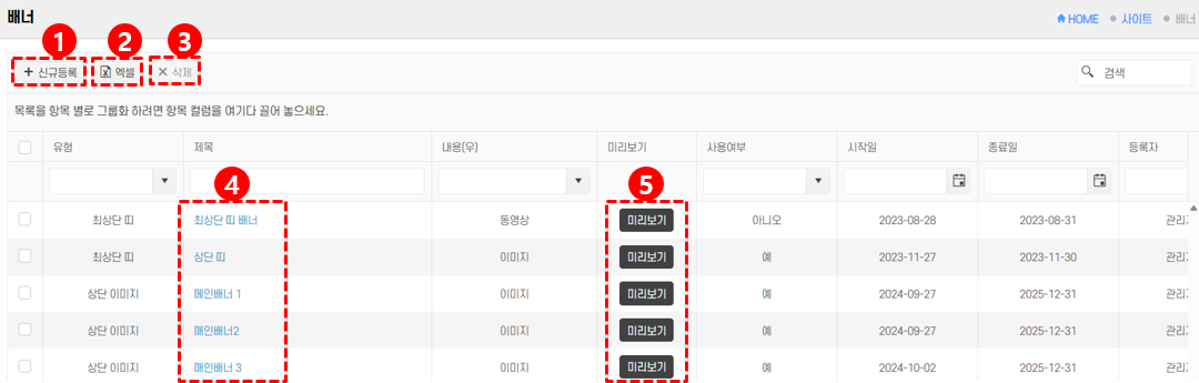 - 등록된 배너의 제목 및 유형(이미지/동영상), 사용 여부, 기간 등의 정보를 확인할 수 있습니다. (=배너-신규등록)