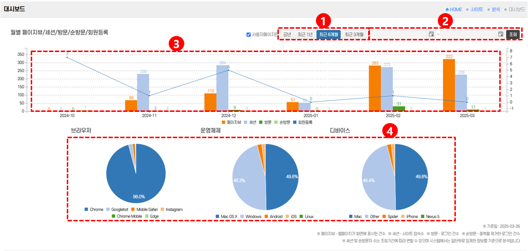 • 월 단위로 페이지뷰, 세션 수, 방문자 수, 순방문자 수, 회원 가입 수를 시각화하여 표시합니다.