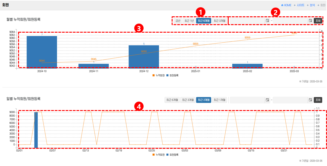 - 월별 또는 일별 회원 데이터를 분석하여 웹사이트 이용 추세를 파악합니다.