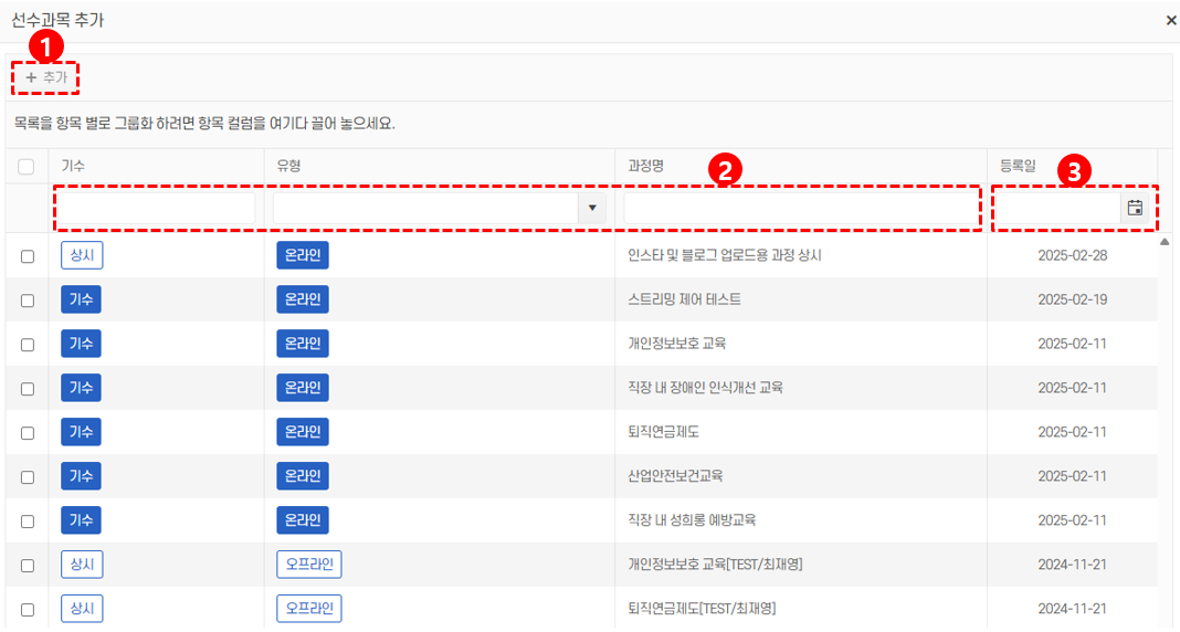 추가버튼을 클릭합니다. 검색창을 활용하여 과정명을 입력하고 원하는 선수과목을 조회합니다.등록일 필터를 사용하여 특정 기간 동안 등록된 선수과목만 조회할 수 있습니다.- 목록에서 원하는 선수과목을 선택하여 등록을 완료합니다.