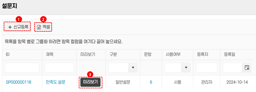 클릭 시 설문지 등록 화면으로 이동하며, 문항 추가 및 옵션 설정 가능