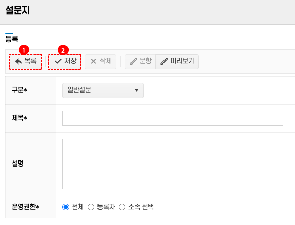 운영권한: 해당 설문지를 누가 열람/사용 가능한지를 설정