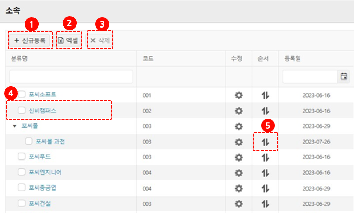 - 소속 순서는 변경 가능하지만, 등록일을 기준으로 기본 정렬됩니다.