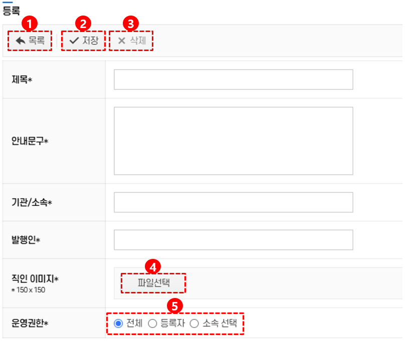 - 필수 항목(제목, 안내문구, 기관/소속, 발행인, 직인 이미지, 운영권한)을 입력해야 저장할 수 있습니다.
