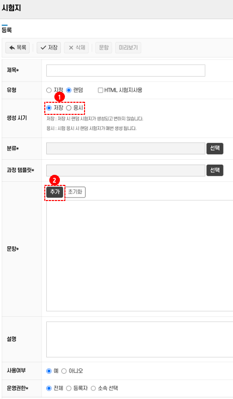 설명, 사용여부, 운영권한 등은 일반 시험지와 동일하게 설정됩니다.