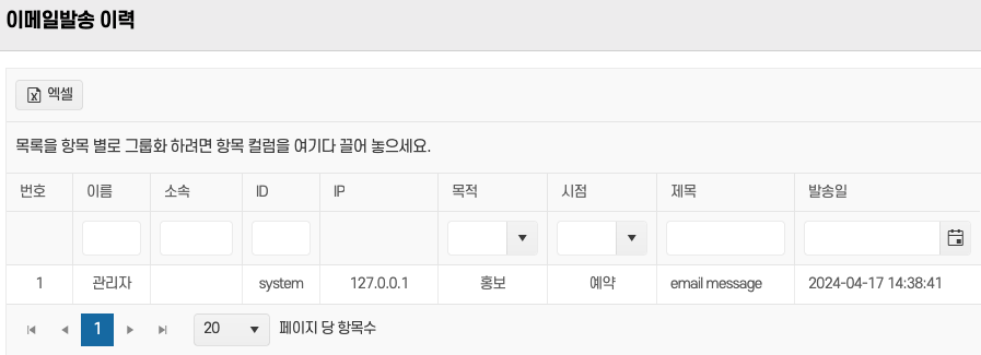 • 현재 화면에 표시된 발송 이력을 엑셀 파일로 저장 가능