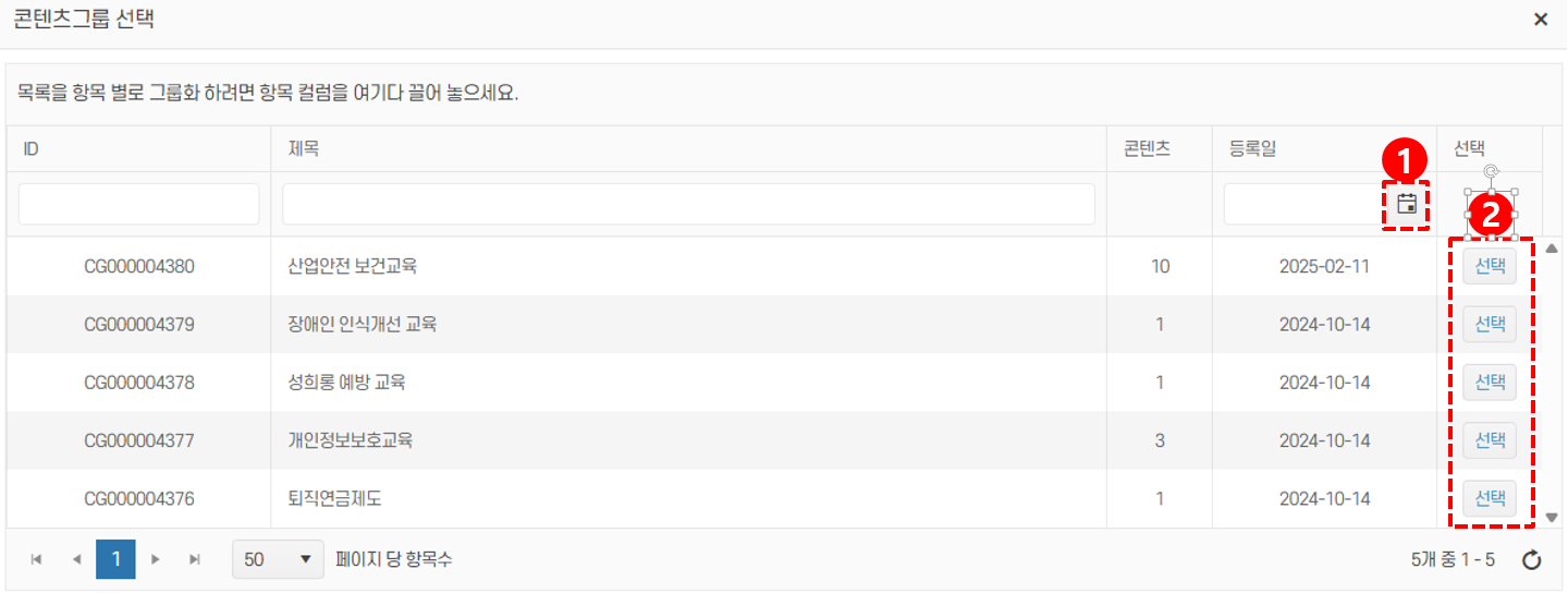 콘텐츠 그룹을 등록일 기준으로 정렬하거나 검색할 수 있습니다.