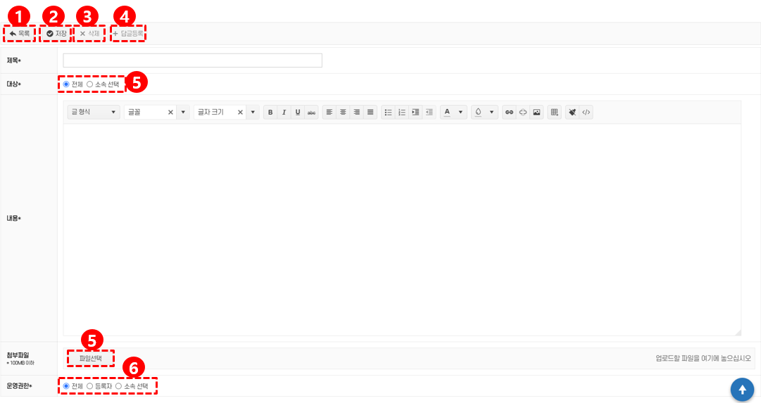 • 작성 중인 내용은 저장하지 않으면 사라지므로, 반드시 저장 버튼을 눌러야 합니다.