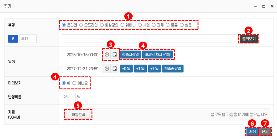 유형 선택에서 적절한 학습 유형을 선택하지 않으면 정상적인 진행이 어려울 수 있습니다.불러오기기능을 사용하면 기존 데이터를 빠르게 적용할 수 있습니다.날짜 조정을 활용하면 차시 간격을 쉽게 설정할 수 있습니다.파일 선택을 통해 학습에 필요한 자료를 업로드할 수 있습니다.저장을 누르지 않으면 입력한 정보가 반영되지 않습니다.