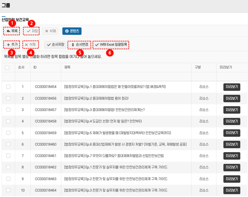 일괄등록기능을 활용하면 효율적입니다. - 콘텐츠 순서는 수강자에게 그대로 노출되므로 학습 흐름을 고려해 조정하는 것이 좋습니다.