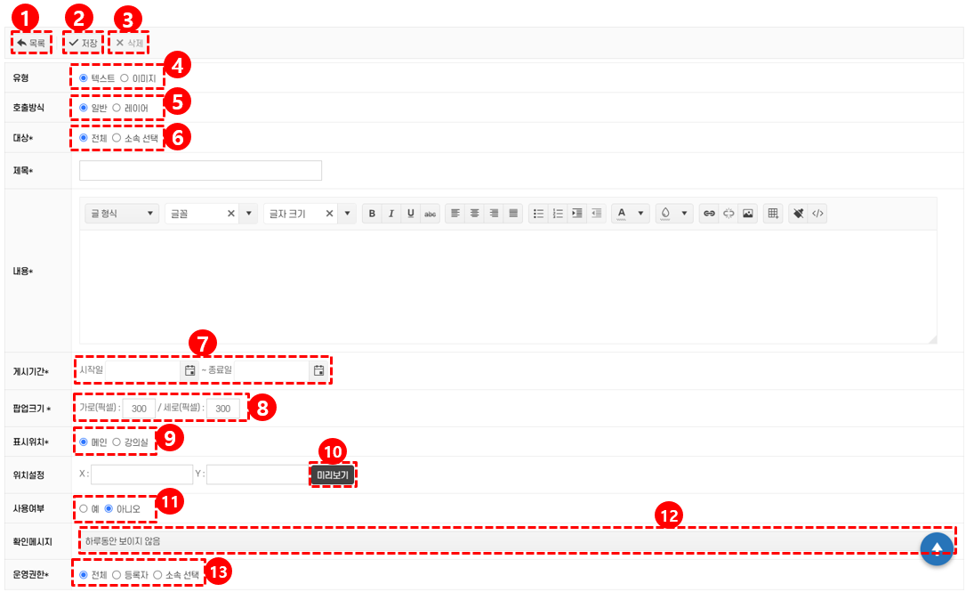 - 팝업 유형에 따라 텍스트 에디터 또는 이미지 업로드 영역이 나타납니다.