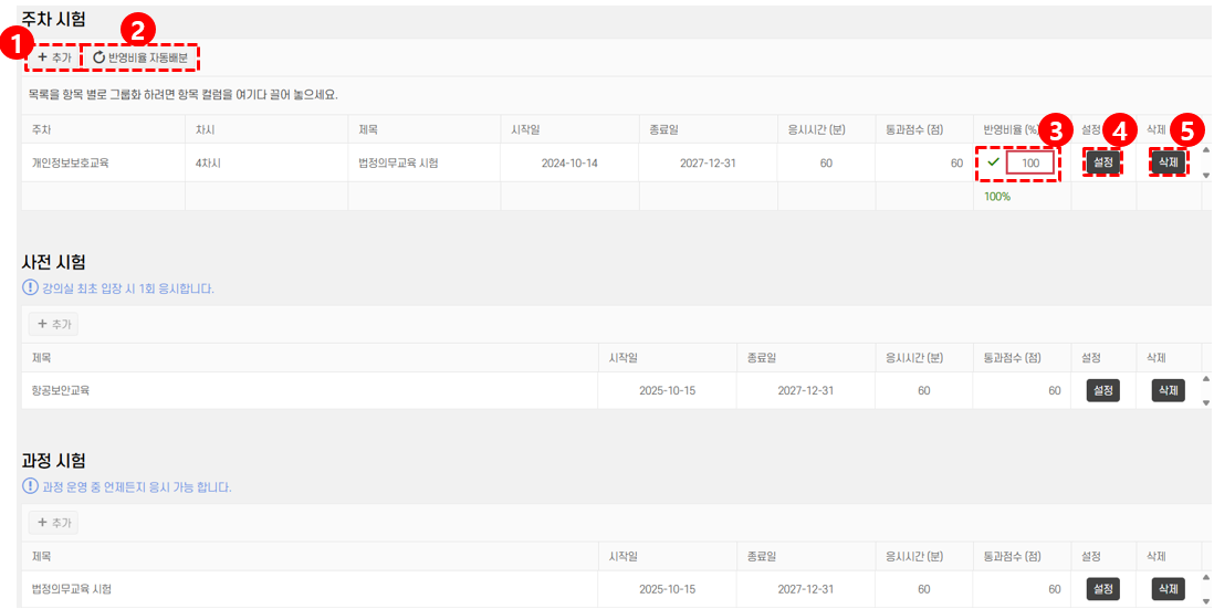 추가버튼을 사용하면 새로운 시험을 등록할 수 있습니다.반영비율 조정에서 모든 시험의 합이 100%가 되어야 정상적으로 반영됩니다.반영비율 자동배분기능을 사용하면 모든 시험이 균등하게 분배됩니다.삭제버튼을 클릭하면 해당 시험이 목록에서 제거되므로 신중하게 사용해야 합니다.- 시험은 사전 시험과 과정 시험으로 구분되며, 필요한 시험 유형에 맞게 추가해야 합니다.