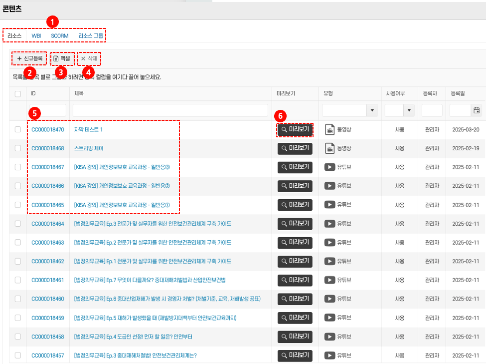 신규 콘텐츠 등록부터 삭제, 미리보기까지 모든 기능을 통합 제공하는 핵심 관리 메뉴입니다.