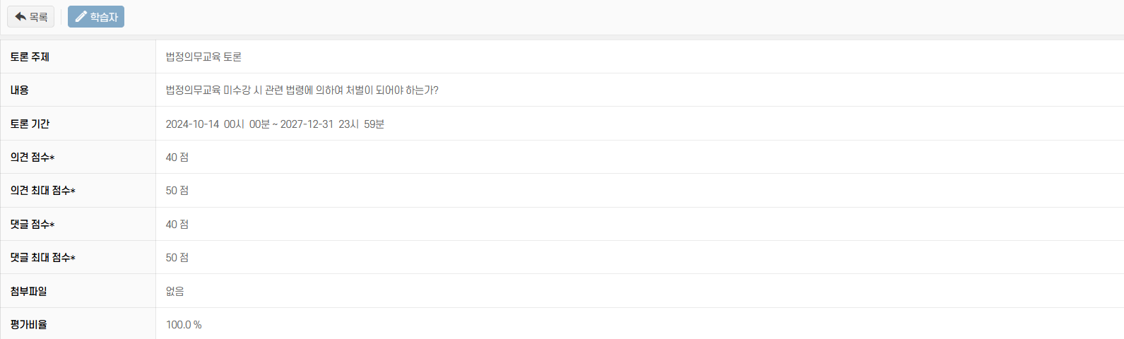 - 토론 참여자 현황, 제출 여부, 점수 등을 확인할 수 있습니다.