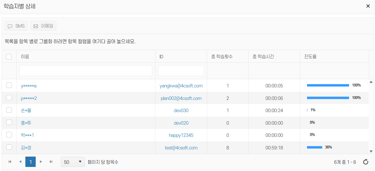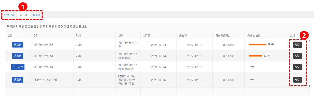 • 각 차시별 오른쪽에 위치한 보기 버튼을 클릭하면 해당 주차에 대한 학습자별 세부 정보를 확인할 수 있습니다.