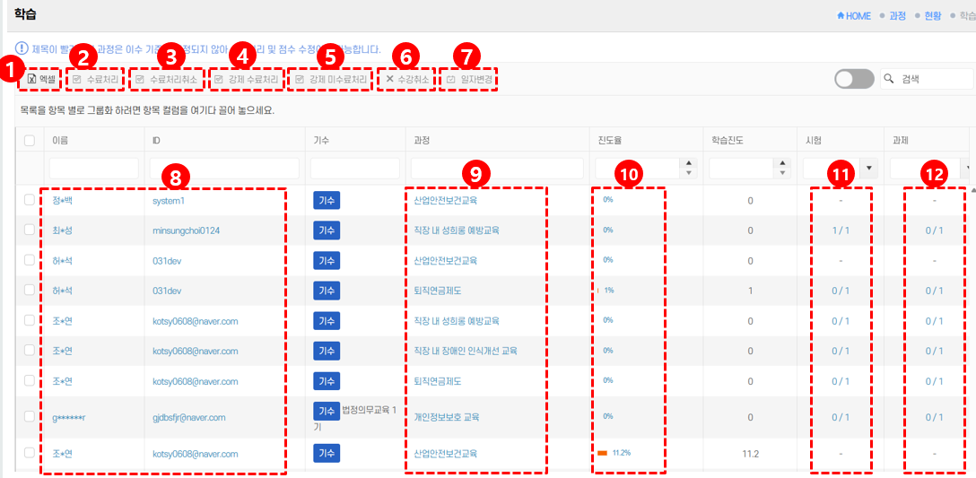 [[수료처리]],[[일자변경]])을 클릭하여 처리합니다. - 검색창 또는 필터 기능을 활용하여 이름, ID, 과정명 등으로 대상자를 빠르게 찾을 수 있습니다.