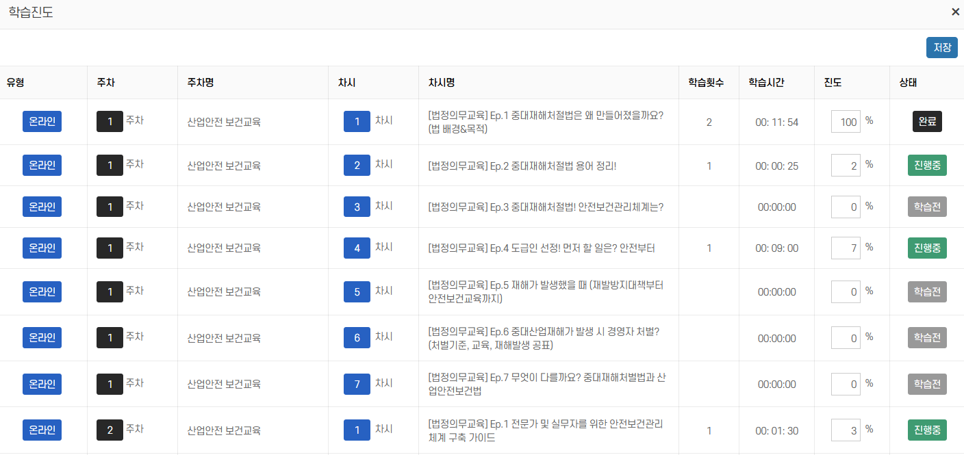 강제 수료처리기능을 사용해야 합니다. 수강취소시 해당 수강 내역이 삭제되며 복구가 불가능하므로 주의가 필요합니다.- 진도율은 자동 업데이트되며, 일부 콘텐츠에서는 수동 반영이 필요할 수 있습니다.
